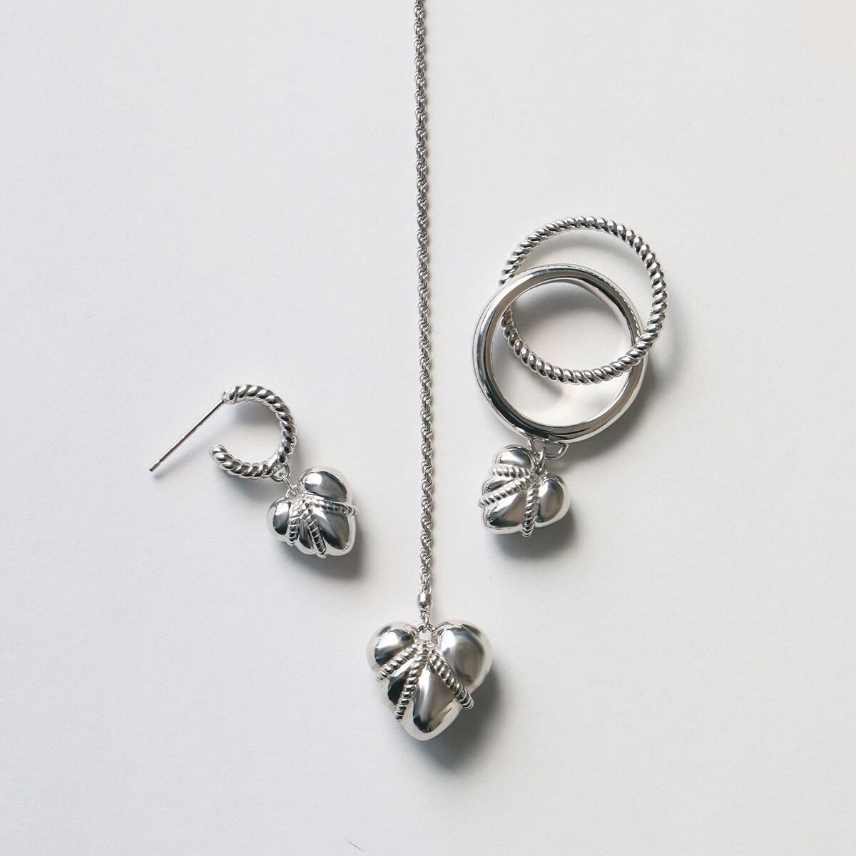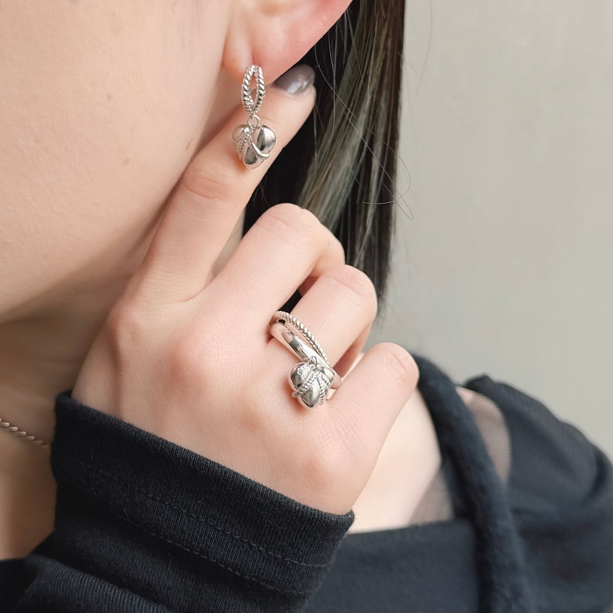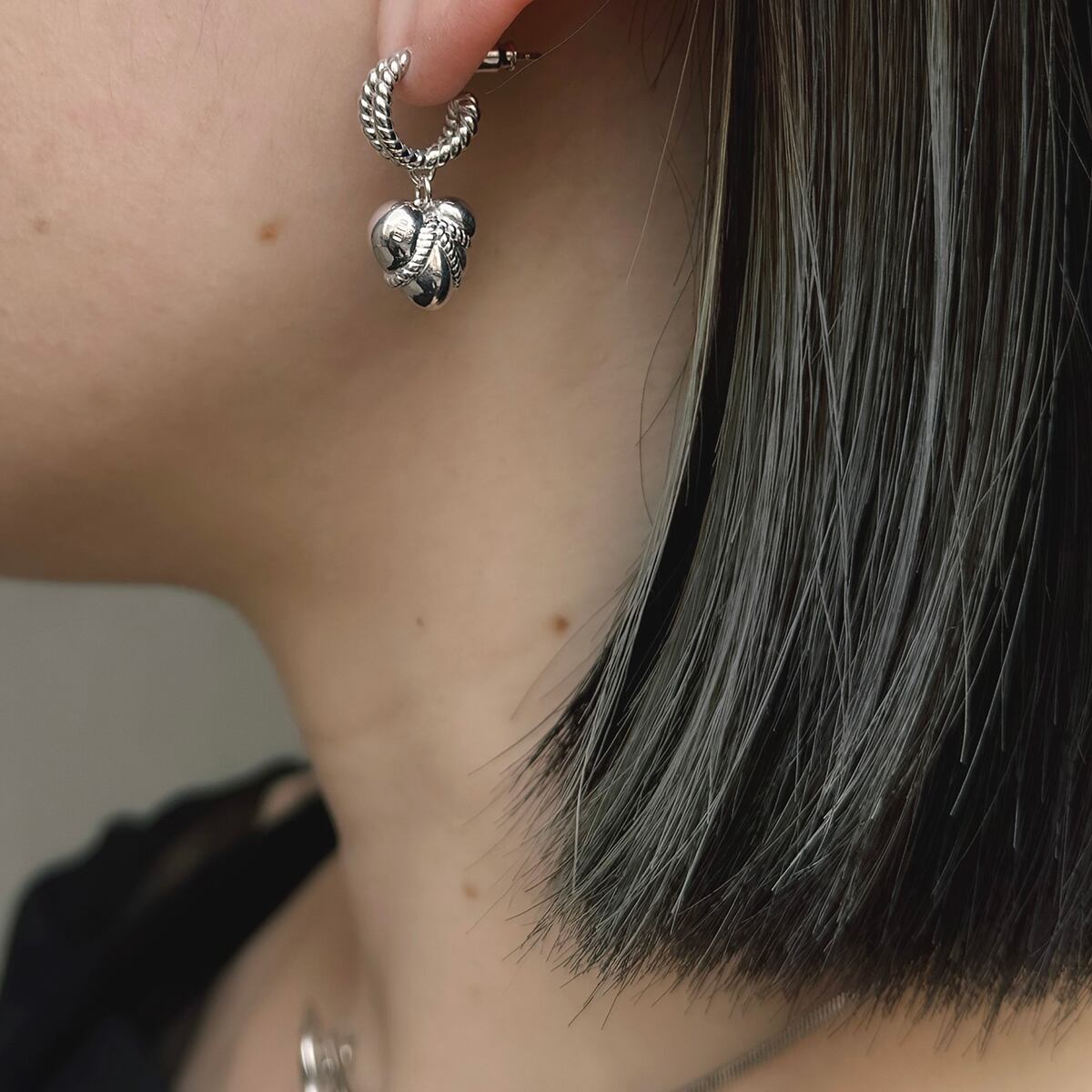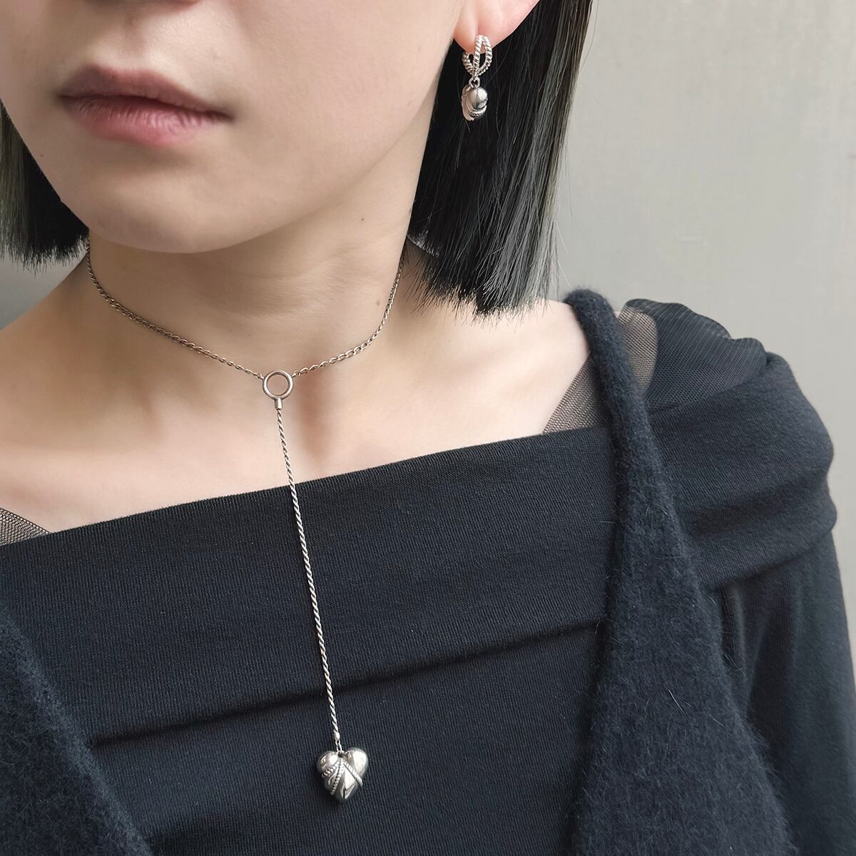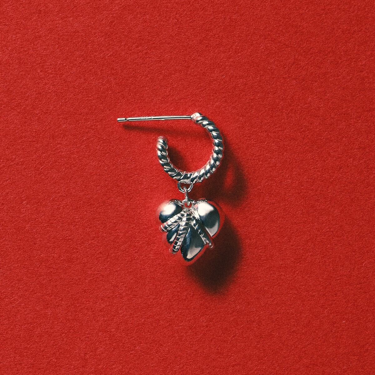 ハートをぎゅっと縛り、もっちりとした肉感を表現したIKEDAHIKARI.らしいハートモチーフのピアス。身に着けると、ロープで吊られたハートがゆらゆらと揺れ動きます。可愛らしいハートのイメージを残しながらも、どこかエロティシズムを感じさせるデザイン。甘さだけじゃない、静かな色っぽさを添えるジュエリーです。