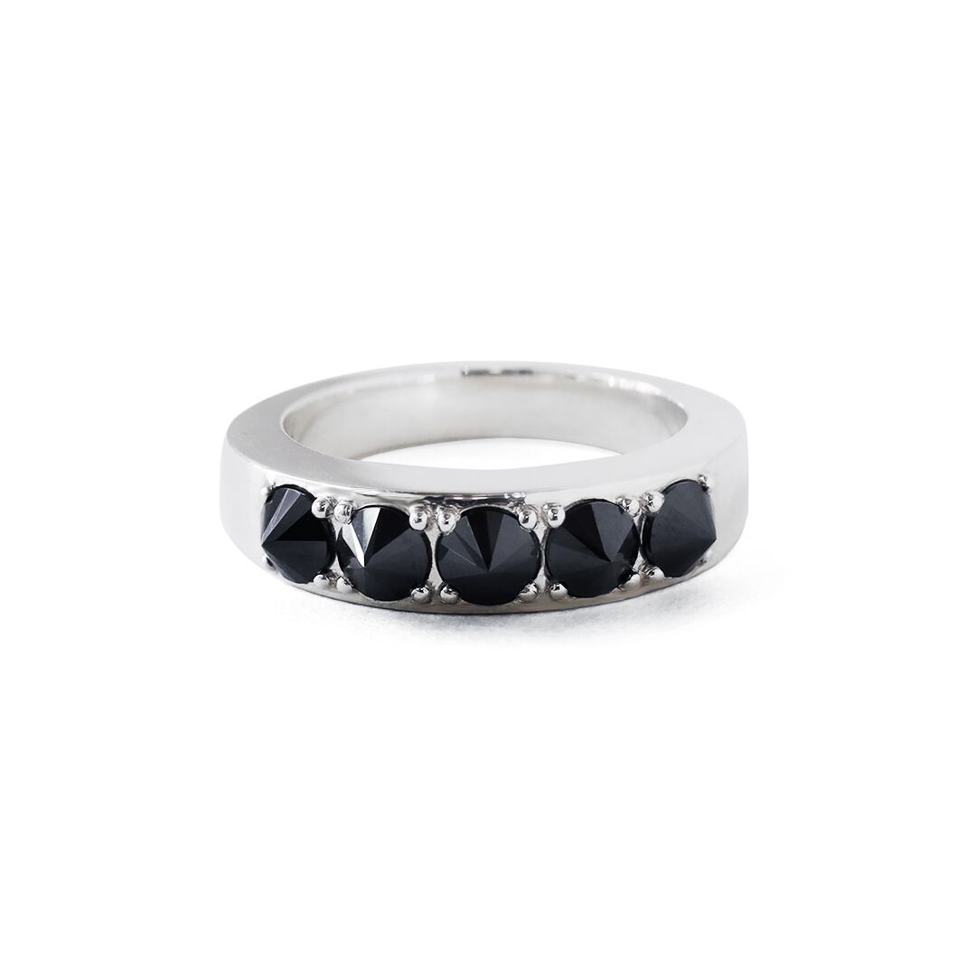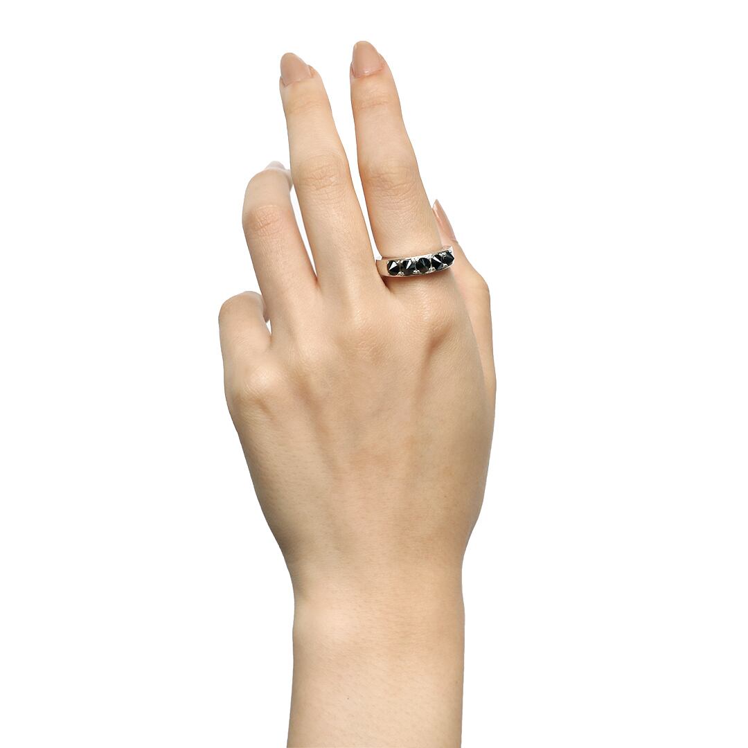あえて石を逆さにセットし、スタッズが留められたようなデザインのシルバーリング。大ぶりなブラックジルコニアがエッジィな雰囲気でキラキラと輝きます。尖ったシルエットがクールな印象を与える、ジェンダーレスなデザインです。