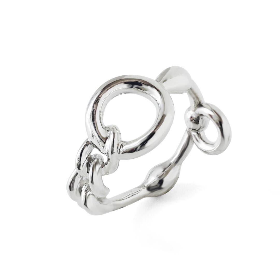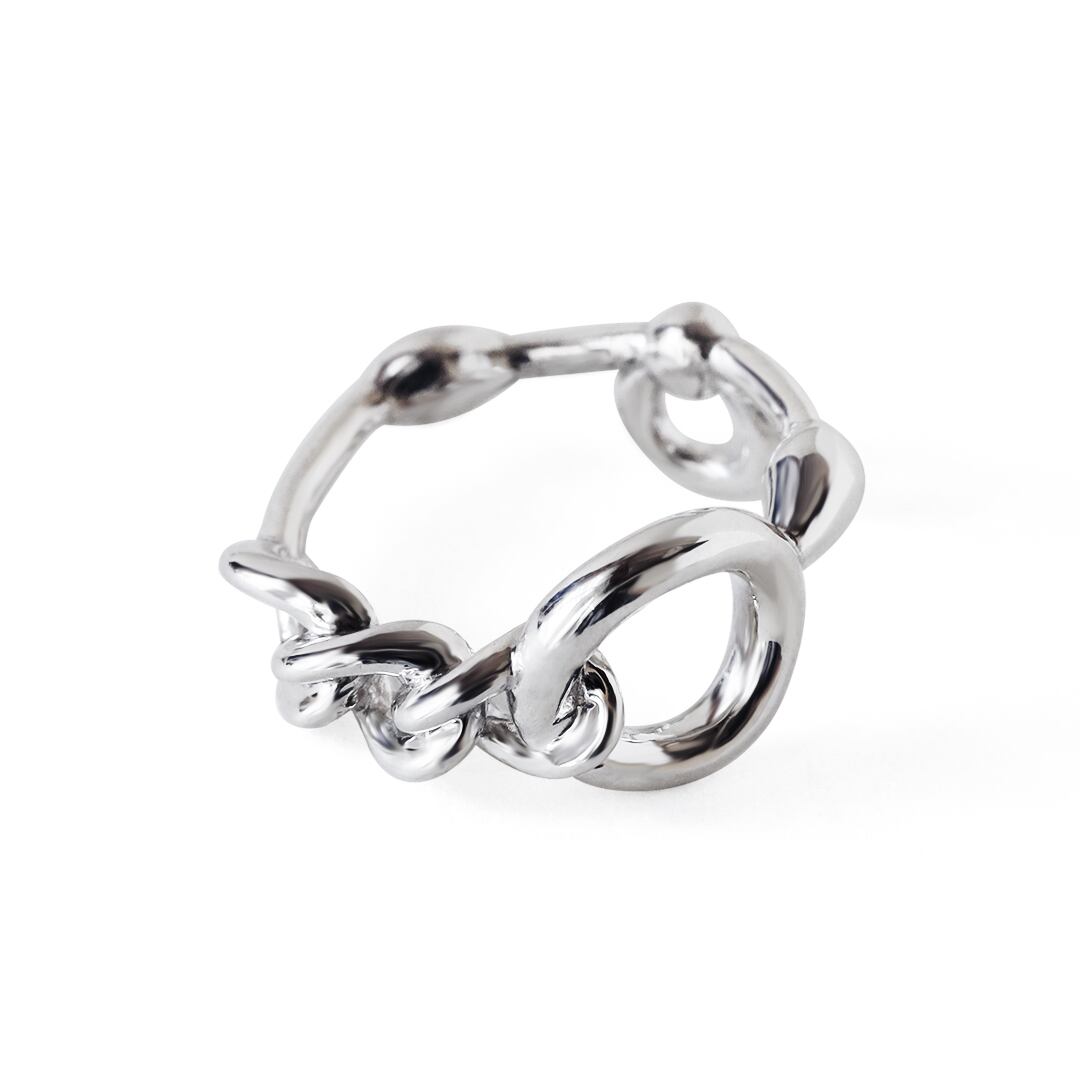 チェーンやボディピアスなどいろんなパーツをミックスしてできたリング。1周表情が違うので、気分で向きを変えて着けられます。ゴシックなパーツでも強すぎずモードなデザイン。