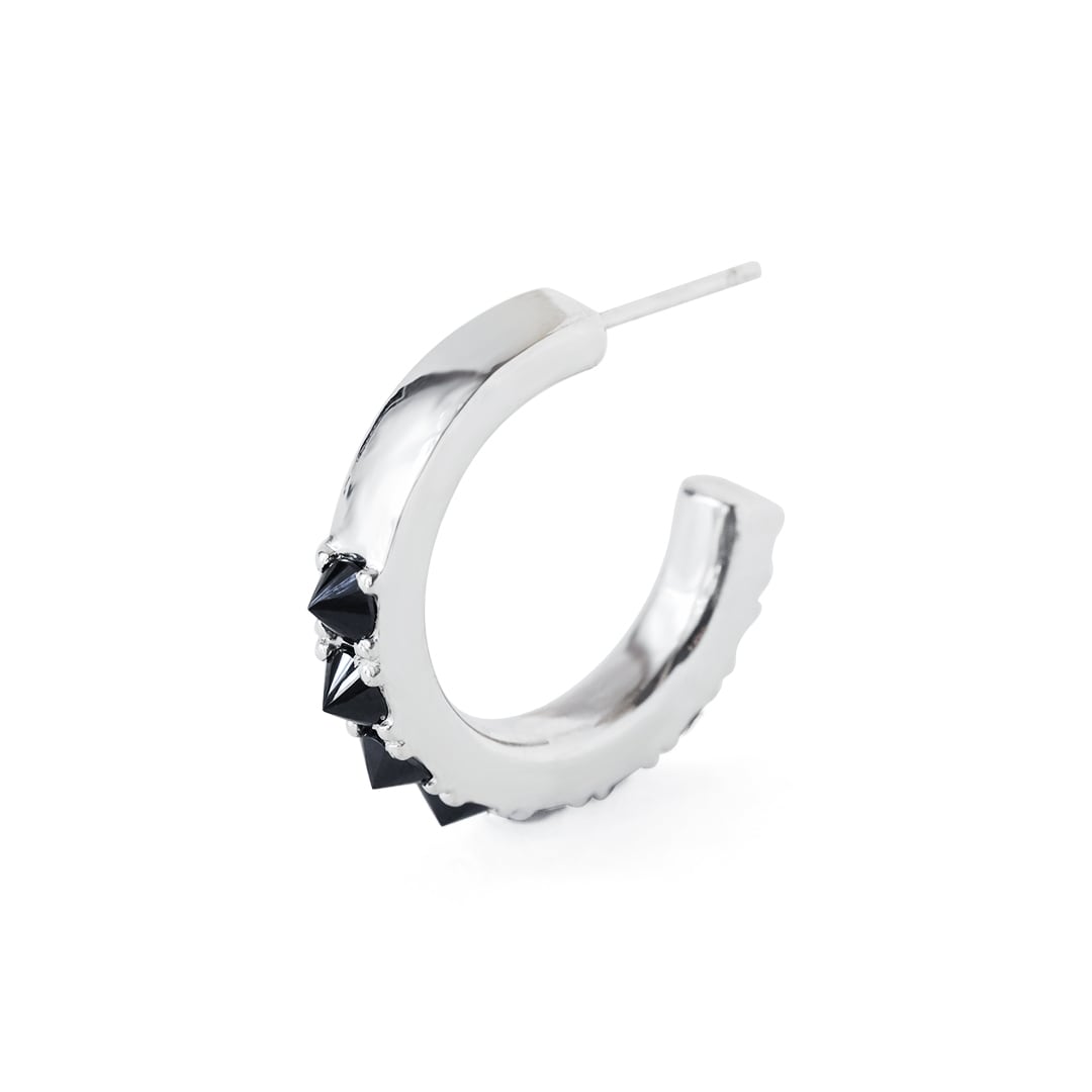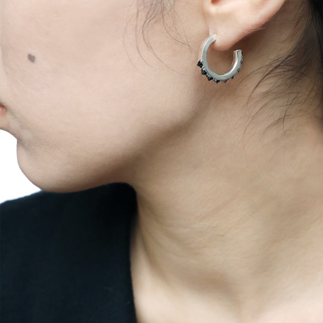 あえて石を逆さにセットし、スタッズが留められたようなデザインのピアス。2つのセットで、それぞれ上下半分ずつ石留めされたエッジィなデザイン。キュービックジルコニアがキラキラと輝き、耳元をクールで華やかにしてくれます。