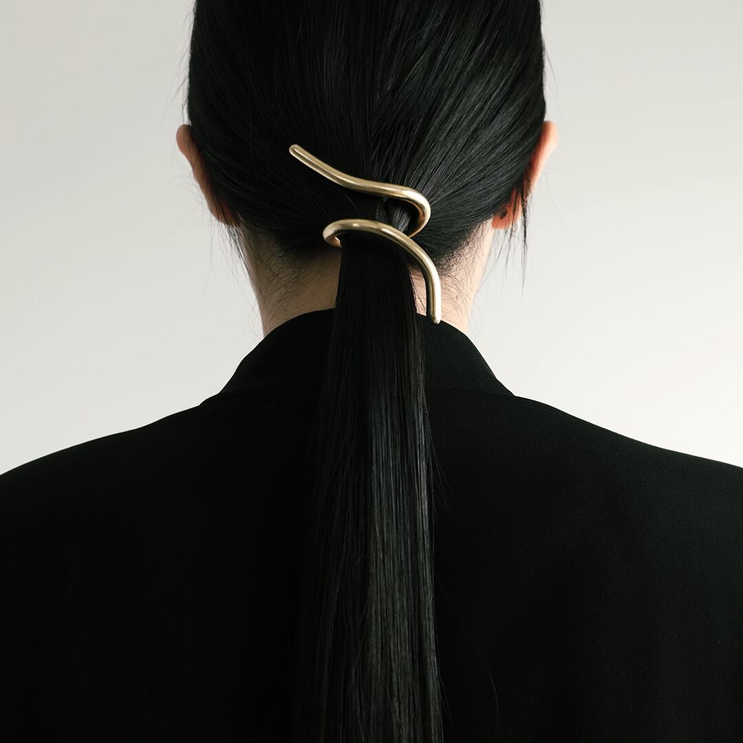 シンプルでありながら大胆なデザインのヘアカフ。メタルのラインが髪の毛を取り巻き、モードな印象を与えます。お手持ちのヘアゴムに、フックを引っ掛けてご着用いただけます。ロングヘアの方におすすめのヘアカフです。